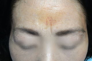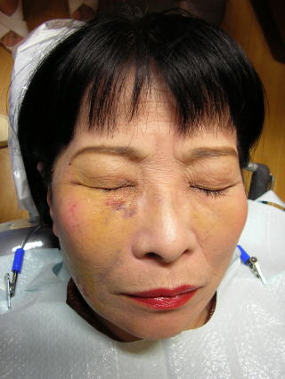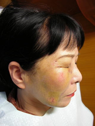 3日目 (10月12日)。頬骨部の上皮化(内Diathermyとうるおい治療の効果)と皮下出血斑の消失(内DiathermyとHSPの効果)が著明。サングラスが不要になったと喜んだ