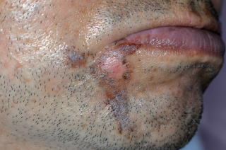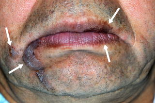 初診時(2009年5月29日)、65歳。黒変部中央は水疱がすでに破れている(激痛部位)
