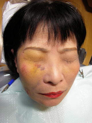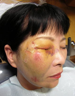初診時(2006年10月10日)、63歳。右頬骨弓部、右頤部、右下顎角部に痂皮形成を伴う擦過創を認める。特に右内眼角部、下眼瞼の皮下出血斑が著明。受傷後約10分で出血斑が現れたようである